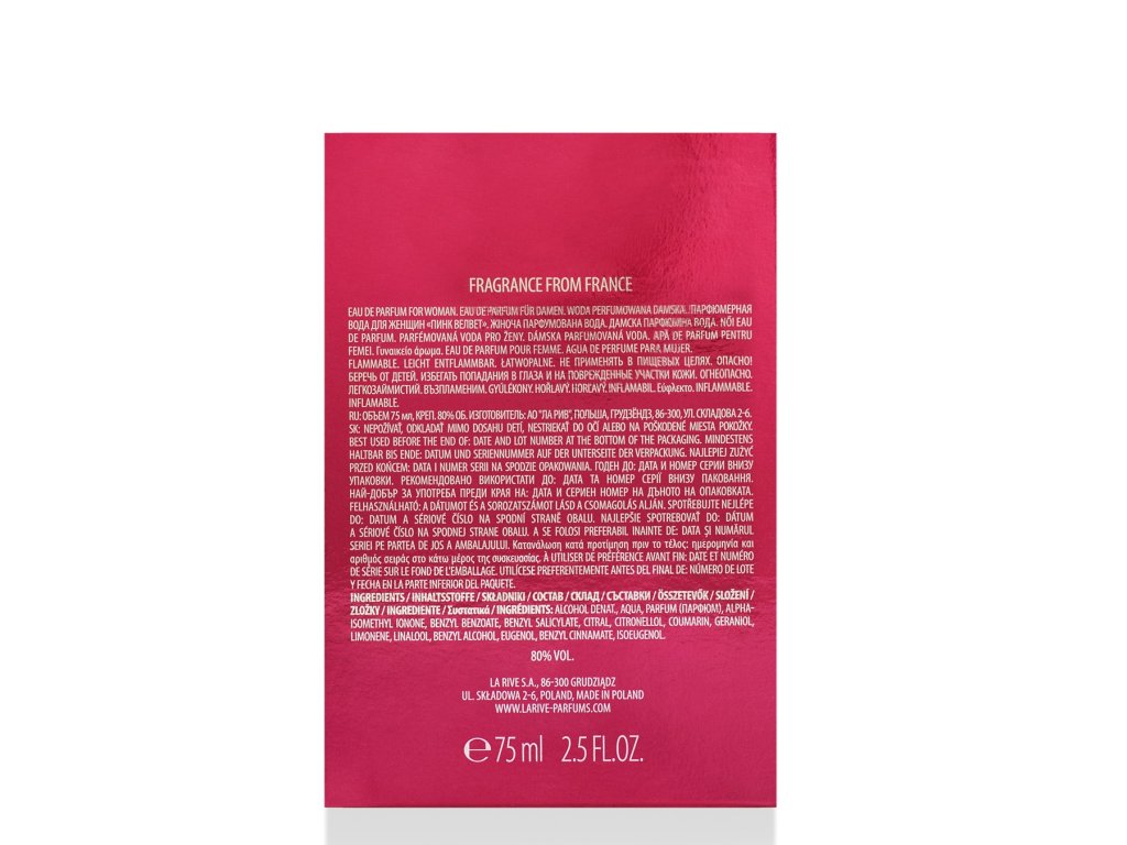 Predstavte si všetko, čo vám v živote prináša radosť a vzrušenie z krásnych emócií a zabaľte sa do tejto energie. Už to cítite? … Takto pôsobí na zmysly veľmi zmyselná kompozícia PINK VELVET. Je to vôňa inšpirovaná odtieňmi ženskej krásy a neobmedzeným pocitom slobody – nájdete tu noblesné tóny jazmínu, kosatca a pomarančových kvetov so šťavnatým nádychom čiernych ríbezlí a hrušky. Príjemne upokojujúci základ tvorí sladkosť vanilky a praliniek v kombinácii s elegantným charakterom pačuli a doplnkovým nádychom mandlí a fazule tonka. Spoznajte všetky inkarnácie radosti zo života a precíťte ich zamatový dotyk vo vôni PINK VELVET od LA RIVE.