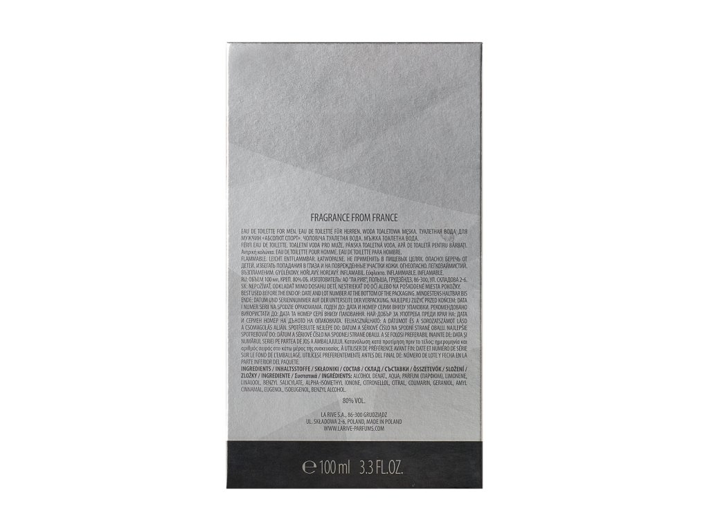 Objavte sviežosť teplých citrusových plodov a energiu morských vôní. Nechajte ich prebudiť vašu myseľ tesne predtým, ako čistá vôňa cédrového dreva upokojí vaše zmysly. Aura tajomstva potrebuje trochu korenia – zažite výrazné tóny korenia, ktoré spolu s aromatickou silou kvetu neroli osviežia vašu hlavu aj telo. Základ vône prekvapí kombináciou ušľachtilej ambry, klasického bieleho pižma a originality fazule tonka s nádychom sladkej vanilky. Dovoľte sile tejto zmyselnej vône prúdiť cez seba a buďte si absolútne istí sami sebou a svojím výberom s LA RIVE ABSOLUTE SPORT.