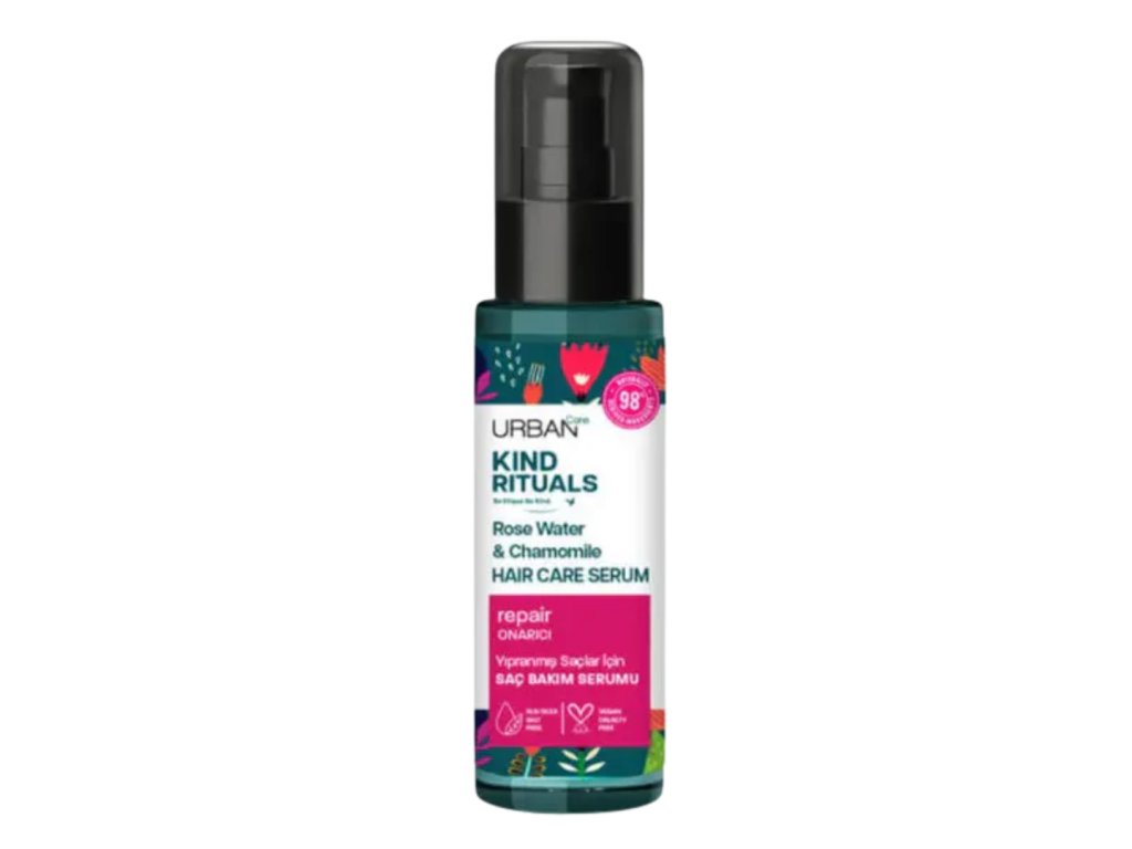 Urban Care Kind Rituals sérum na vlasy s ružovou vodou, výťažkom z harmančeka, kyselinou hyalurónovou a provitamínom B5 poskytuje intenzívnu hydratáciu, uhladzuje krepovatenie a obnovuje lesk bez zaťaženia vlasov.