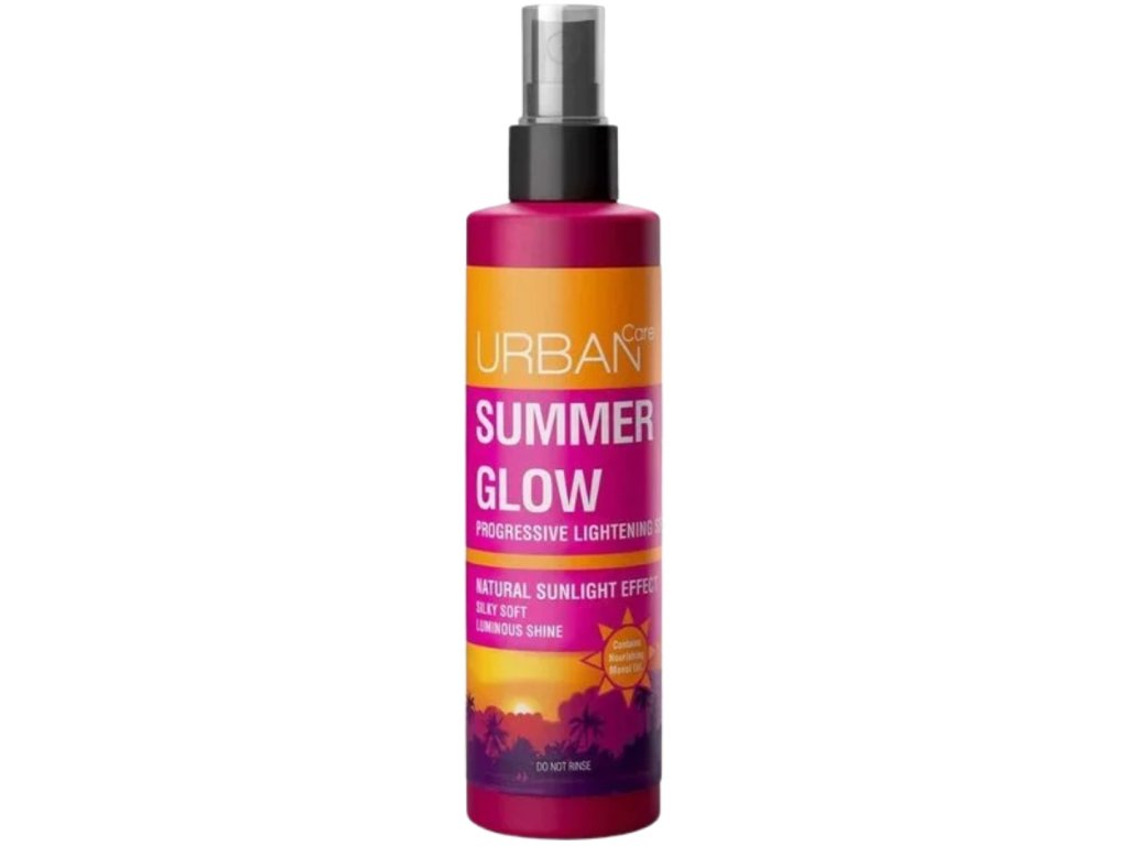 URBAN CARE Summer Glow zosvetľujúci sprej s obsahom monoi oleja a rastlinného keratínu jemne zosvetľuje vlasy bez ich vysušovania, a to už po 3–5 použitiach. Vytvára prirodzený, slnkom pobozkaný efekt, uľahčuje rozčesávanie, vyživuje a dodáva vlasom lesk a hebkosť – bez amoniaku a parabénov.